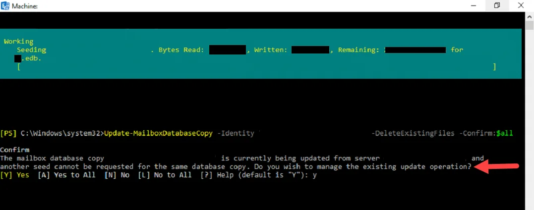 In Exchange 2016, if you work a lot in the Exchange Management Shell (EMS) like I do and you busy with a seed operation and you by accident close the Management Shell you may think that all is lost? Actually it isn’t. The seed operation is still running in the background. You may be wondering how you can check your seed operation now and you can do so by simply running the same command again and you will be prompted to “Manage the existing update operation” as shown below: