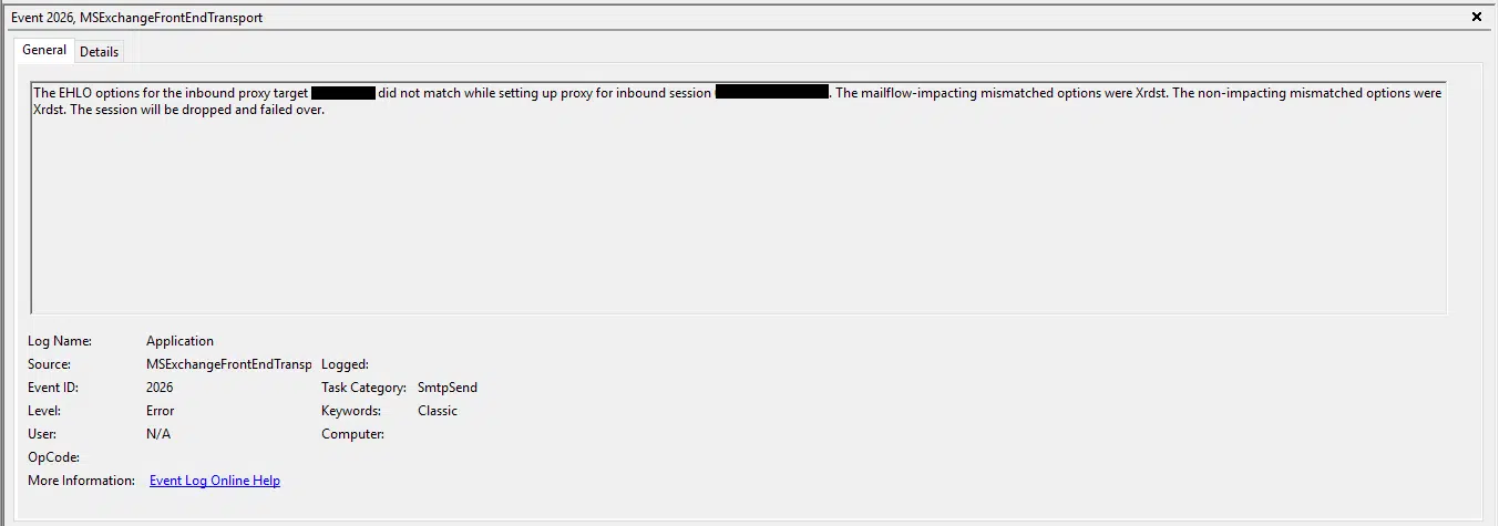 If this was giving an error such as PRX2 or PRX5, I would have checked for DNS related errors in the logs and also checked DNS settings on the connectors but there was no need to do that. In the application event logs, there were absolutely no errors except for one that would occasionally come up which is shown below: